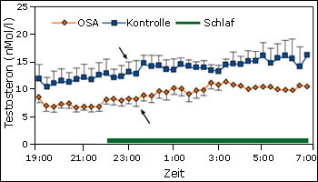 Abb. 3: Auswirkung der Schlafapnoe auf die Testosteronsekretion. Pfeile markieren das Auftreten der ersten REM-Phase (nach Luboshitzky et al., 2002). OSA = Patienten mit obstruktiver Schlafapnoe (n = 10); Kontrollpersonen (n = 5) |