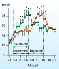 Abb. 2: Mittlere Serum-Testosteronspiegel von gesunden jungen Männern mit Nachtschlaf (grün) und Tagschlaf (orange) (nach Axelsson J; et al., 2000). |
