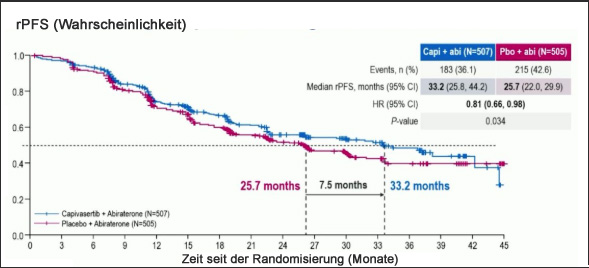 Abb.: Die Studie erreichte ihren primären Endpunkt: Capivasertib verlängerte das rPFS um 7,5 Monate (Median: 33,2 vs. 25,7 Monate;