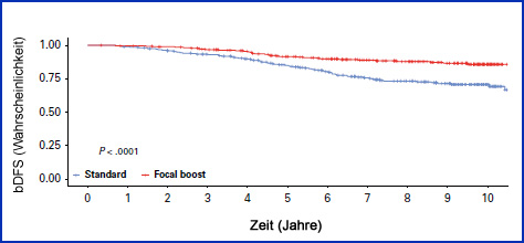 im Arm mit fokaler Boost-Therapie (HR 0,48 [95 % KI 0,33 bis 0,69]; p <0,001); die 10-Jahres-Ergebnisse für das lokale DFS