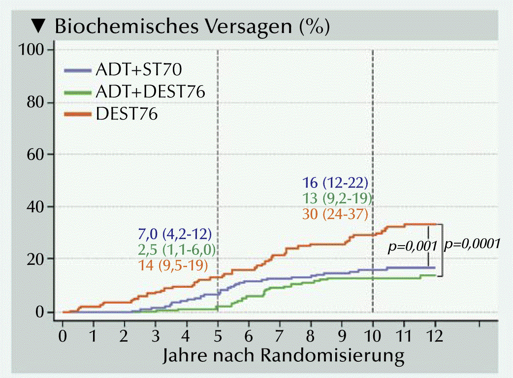 In der DEST76-Gruppe blieb der normale Testosteronspiegel im Studienverlauf stabil. Bei Patienten mit ADT dauerte es 20 Monate bis der normale Testosteronspiegel wiederhergestellt war. Bei Patienten mit und ohne ADT stellte sich bei 32% bzw. 18% kein normaler Testosteronspiegel je wieder ein (p <0,001).